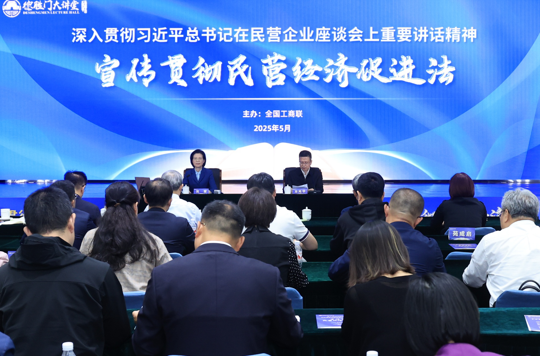 5月12日下午,全国工商联在京举办深入贯彻习近平总书记在民营企业座谈会上重要讲话精神、宣传贯彻民营经济促进法德胜门大讲堂专题活动。全国人大常委会法工委副主任王瑞贺宣讲解读民营经济促进法,中央统战部副部长、全国工商联党组书记沈莹作总结讲话。全国工商联领导班子成员王受文、安立佳、汪鸿雁出席活动,方光华主持活动。