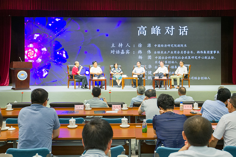 高峰对话环节在中国经济研究院副院长徐源的主持下,中国社科院社会政策研究中心副主任杨团、韩伟集团董事长韩伟、金恪特色小镇集团总裁孙文华、大北农集团副总裁莫宏健与佳格天地联合创始人张文鹏,从产业融合、特色小镇、品牌强农、科技兴农等不同角度分享了经验心得。