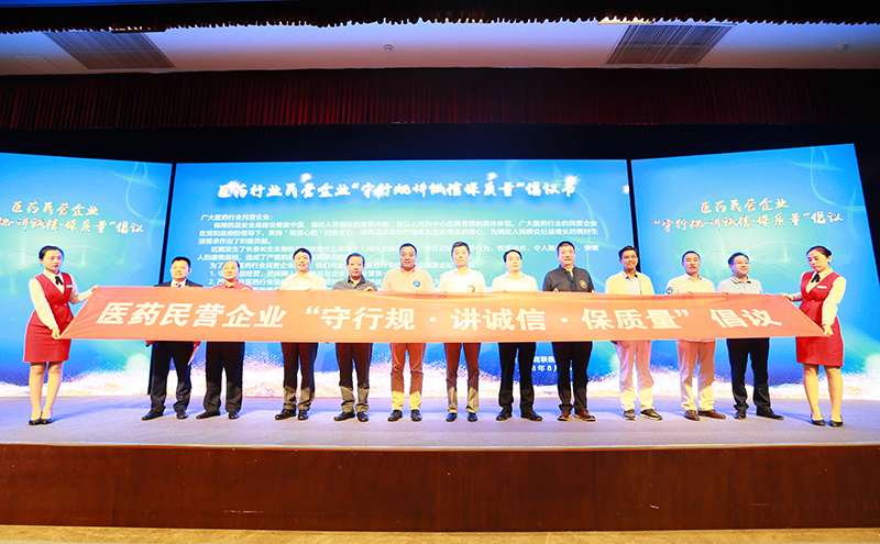 最后,全国工商联医药业商会向广大医药企业发起“守行规讲诚信保质量”倡议。商会副会长兼秘书长王之光宣读了倡议,呼吁广大医药企业要诚信守法经营,严把质量关,为保障人民群众的身体健康,创建和谐文明的社会做出医药企业应有贡献。企业家代表纷纷在倡议书上签字。