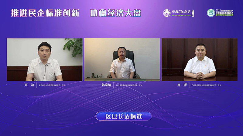 在“区县长话标准”环节中,浙江省杭州市滨江区委副书记、区长郑迪,分别从优化顶层设计、对标达标提质、试点示范先行三方面分享了民营经济标准化工作体会。四川省绵阳市游仙区委副书记、区长韩晓清,介绍了游仙区通过结合地方特色,探索标准化军民融合路径、实施全域标准化战略、坚持标准引领的民营经济标准化工作方针。广西壮族自治区柳州市柳南区委副书记、区长肖源,以螺蛳粉为典型代表,从健全全产业链标准,到强化全链条质量监管,介绍了柳州落实习近平总书记“要把住质量安全关,推进标准化、品牌化”重要指示的工作成效。