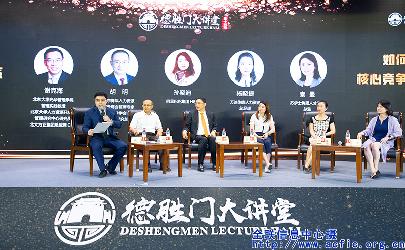 北大方正集团总裁兼CEO谢克海,北京青年人力资源服务商会首席专家、中国劳动经济学会副秘书长、中国人力资本研究院执行会长胡明,阿里巴巴集团HRD孙晓迪,万达传媒人力资源总经理杨晓捷,苏伊士集团人才发展总监秦曼围绕“不忘初心、牢记使命,在中华民族伟大复兴征程中如何构建具有核心竞争力的人才体系”等进行对话,研讨交流。