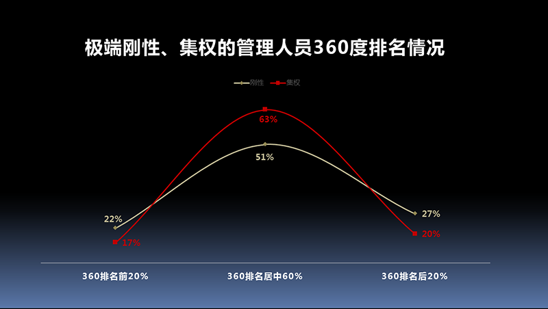 如果说坚持原则的人吃亏,集权的人吃亏,那么这些人在360度素质评价上应该很差。但结果并不是这样。我们把360度素质评价分数从高到低排名,发现集权和刚性的管理人员和其他管理人员在360度评价的分数分布上没有差异。